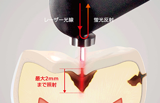 プローブから出たレーザー光は、測定しにくい隣接面や小窩裂溝部の虫歯の歯面から約2mmの深度まで到達し、虫歯に含まれる代謝産物(ポルフィリン)である蛍光反射を読み取り、数値化します。