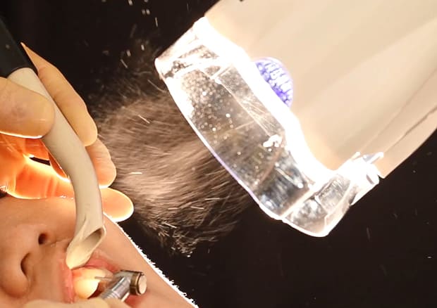 歯を削ったり、銀歯や入れ歯を調整する時に、歯の削りかす、金属片、血液、細菌など目に見えない細かい粉塵が多く飛沫し、水平感染する原因になります。