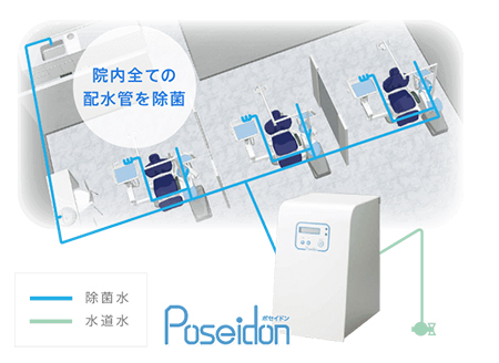 ポセイドンは、人と自然に優しい電解中性機能水を歯科ユニットや医院全体に通水させることにより医院の水配管内の細菌などの繁殖を抑え、治療環境を衛生的に保つためのシステムです。